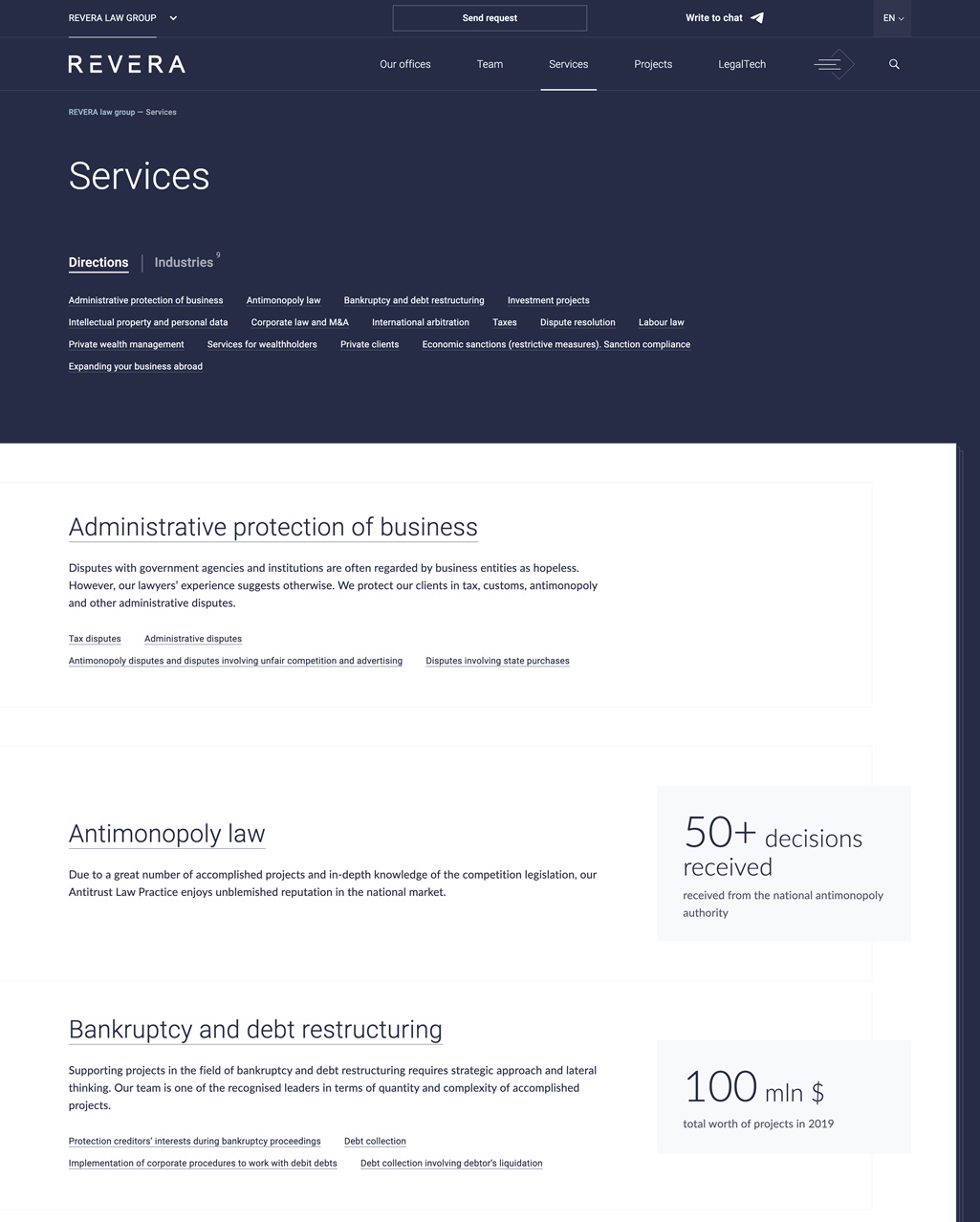 Here the potential client can get acquainted with the REVERA team. With the help of a filter it’s possible to learn what branches this or that specialist works with. It’s also possible to search for a lawyer by industries.