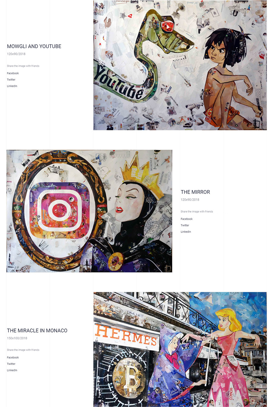 The artist’s works are presented in collections. On the page of an independent collection, the collages are shown in the way the user could have a look at them without clicking on them.
