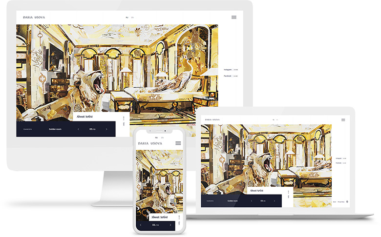On the gallery-website created, the main attention is paid to the artist's works. The design is bright and minimalistic.